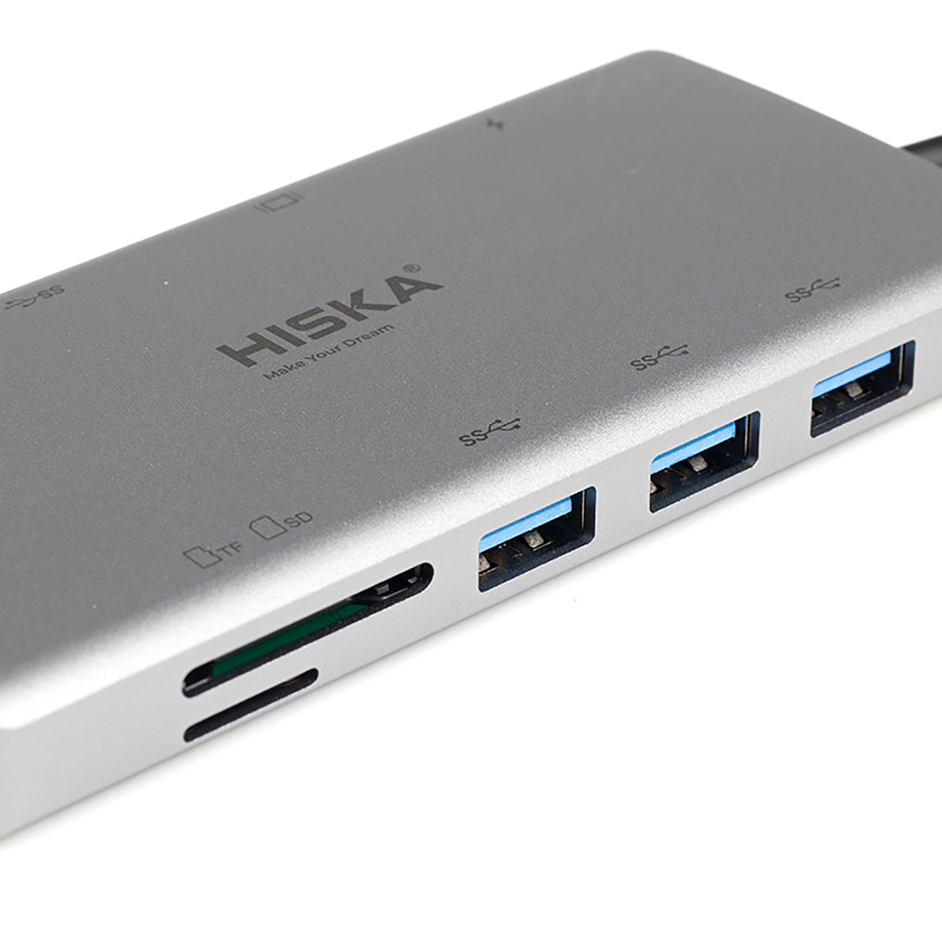 شرکت هیسکا، با ارائه هاب 11 پورت مدل HR-55 ، مشکل کمبود پورت در لپتاپ ها را تا حد زیادی حل کرده است. هاب آداپتور 11 در 1 تایپ سی هیسکا HR-55، دارای 4 خروجی USB 3.0، یک خروجی HDMI، یک خروجی تایپ سی برای شارژ سریع PD، یک خروجی RJ45 شبکه، دو خروجی SD Card و TF Card، یک جک 3.5 میلی متری صدا و درنهایت یک خروجی تصویر VGA می باشد. بدنه این هاب از آلیاژ آلومینیوم بوده و از کیفیت ساخت بسیار بالایی برخوردار است. بوسیله خروجی تایپ سی PD با توان شارژ 100 وات می توان مک بوک پرو یا سایر دستگاه های پشتیبانی کننده از شارژ سریع را در کمترین زمان ممکن شارژ کرد. درگاه شبکه RJ45 این هاب از سرعت شبکه 1000M پشتیبانی میکند . خروجی های USB 3.0 از اکثر دستگاه های یو اس بی مانند فلش درایو ها، هارد دیسک ها، پرینترها و.. پشتیبانی می کنند. همچنین به لطف تکنولوژی USB 3.0، سرعت انتقال دیتا حداکثر 5 گیگابایت بر ثانیه می باشد. برای نمایشگر های نسل قبل که از VGA پشتیبانی می کنند یک درگاه در نظر گرفته شده تا این نیاز نیز برطرف شود. با اتصال این هاب به موبایل و وصل کردن یک کابل HDMI به یک نمایشگر بزرگتر، می توان محتوای موبایل را در یک نمایشگر مجزا و بزرگتر تجربه کرد.