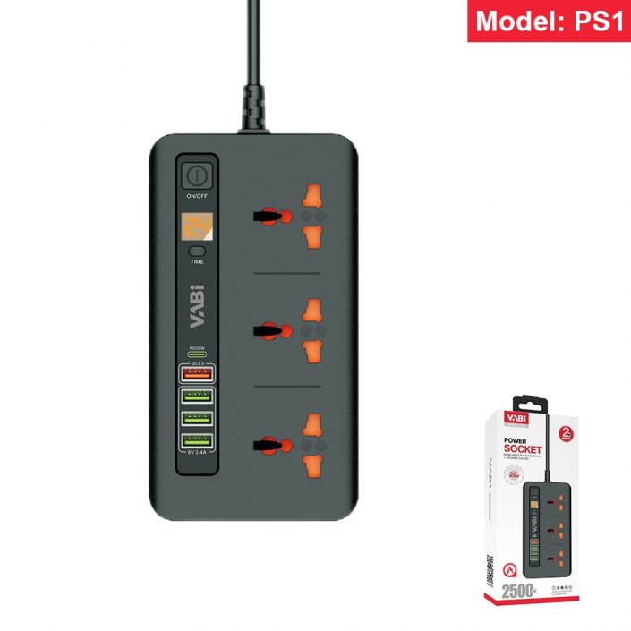 چند راهی برق 2500 وات وابی مدل PS1 مجهز به ۳ پریز برق UK و ۵ پورت USB با فناوری PD20W و QC3.0